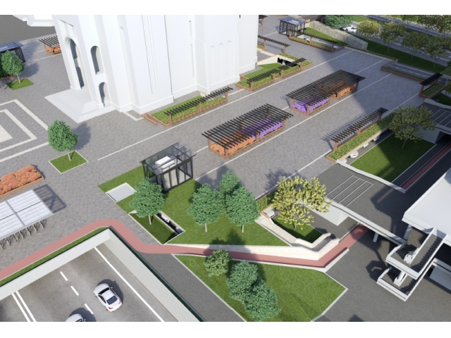 Suprafața construită a parcării este de 6.354,55 mp. Prin proiect se prevede amenajarea platformelor existente din jurul Catedralei Ortodoxe, deasupra parcajului, cu dală urbană pietonală, prevăzută cu spații dalate, spații verzi, mobilier urban, zonă de bike sharing și o porțiune din traseul pistei de biciclete orășenești. Dalajul urban se va extinde deasupra carosabilului până la linia de tramvai din dreptul Casei de Cultură a Sindicatelor.
