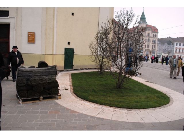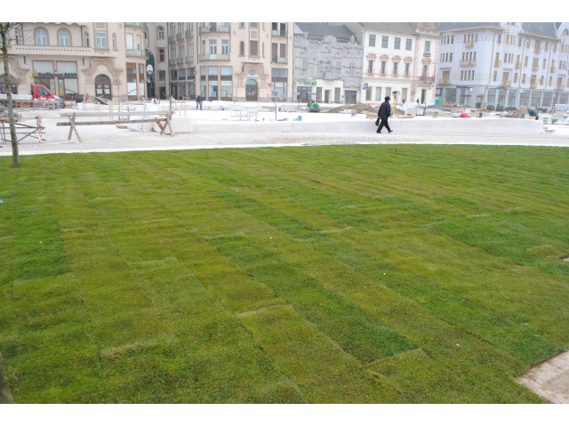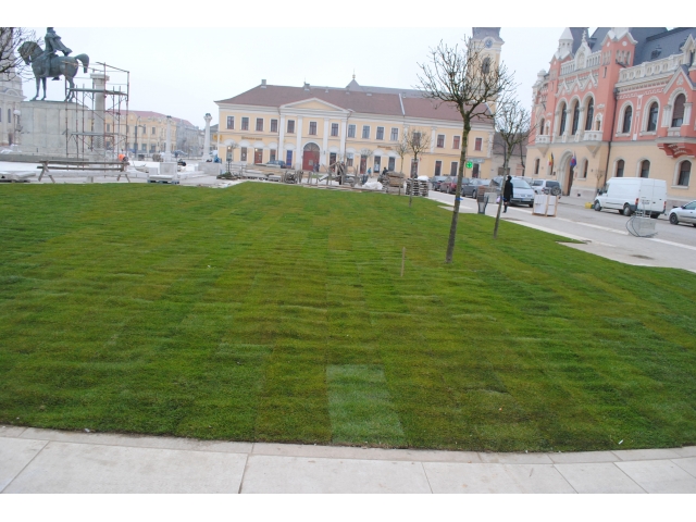 În acest weekend a început montarea gazonului rulou în Piața Unirii, cei 2300 mp de gazon completând amenajarea peisagistică a zonei. Până în prezent, circa 80% din gazon a fost montat.