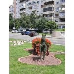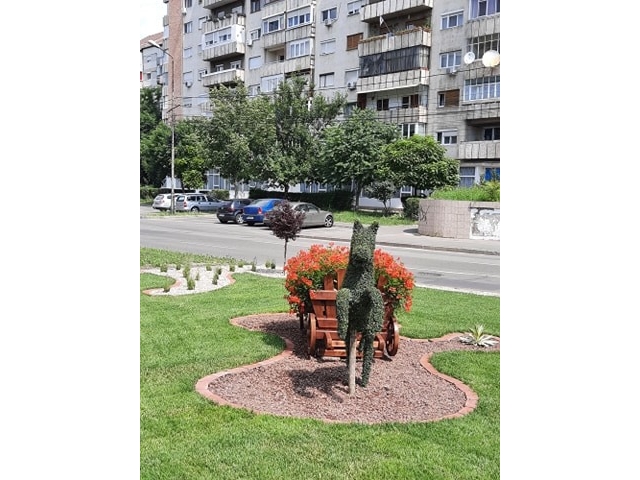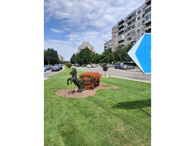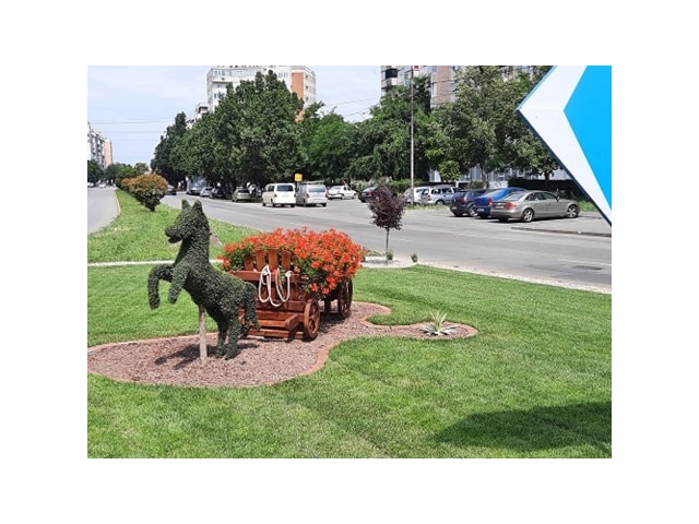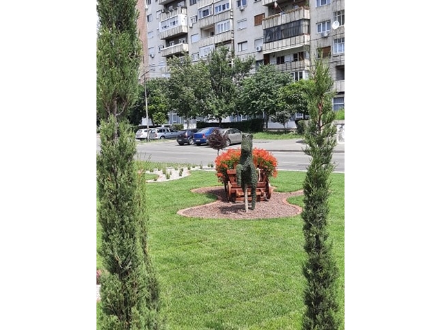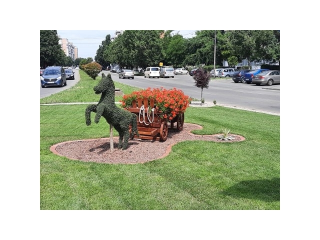 Firma a montat un sistem de irigare, după care a montat gazon rulou și zone cu pietriș alb, a plantat diverse plante ornamentale, iar în mijloc a realizat o compoziție peisagistică cu aspect rustic, alcătuită dintr-o căruță de lemn, încărcată cu flori și o plantă cu formă topiară tunsă în formă de căluț.