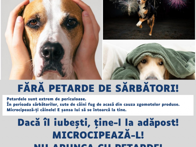 Ultima zi din an este o adevărată provocare pentru mulți stăpâni de câini. Artificiile zgomotoase și colorate și petardele ce explodează pot supăra chiar și cel mai calm patruped. Din păcate, în perioada sărbătorilor de iarnă, tocmai din această cauză, mulți câini fug de acasă, speriați de aceste zgomote. Pentru a le oferi o șansă să ajungă înapoi la stăpâni este obligatoriu ca aceștia să fie microcipați și înregistrați în Registrul de Evidență a Câinilor cu Stăpân. Tocmai de aceea, dacă aveți un câine, trebuie să-i asigurați siguranța și să țineți cont de obligațiile care vă revin.