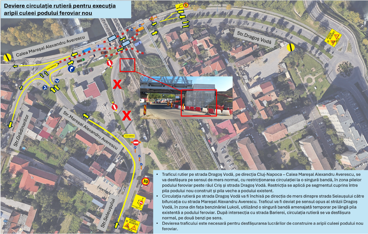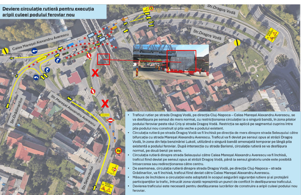 În perioada 18 octombrie – 18 noiembrie 2025 se instituie restricții de circulație pentru executarea lucrărilor de construire a aripii culeei aferente podului feroviar peste Crișul Repede și strada Dragoș Vodă (detalii în cele două planșe atașate).