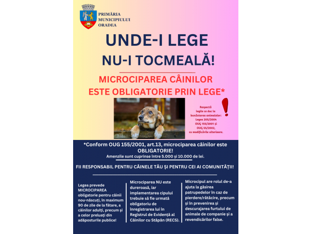 „În primul și în primul rând, trebuie să menționăm că microciparea este o obligație a proprietarului sau a deținătorului de animale, această obligație fiind menționată în PUG 155/2001. Obligația aceasta dacă nu o îndeplinesc, tot legea vine și ne sancționează. Sancțiunea în acest caz este foarte mare, de la 5.000 la 10.000 de lei”, menționează comisarul-șef Nicoleta Alb, șefa Biroului pentru Protecția Animalelor Bihor