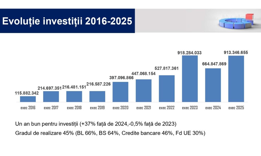 Proiectele din PNRR au accelerat în ritm alert, fondurile europene au avut o pondere semnificativă, iar împreună cu investițiile realizate în colaborare cu Spitalul Județean, suma totală plătită pentru investiții a depășit un miliard de lei — un prag istoric și un indicator al capacității administrative a orașului.