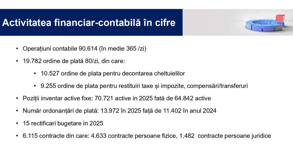 Aproape 20.000 de ordine de plată, peste 70.000 de active fixe, 190.000 de chitanțe fiscale și administrarea a peste 150.000 contribuabili persoane fizice cu debite și 14.000 firme cu debite arată o activitate intensă, bine coordonată și esențială pentru buna funcționare a municipalității, după cum a subliniat directorul adjunct Sorin Iacob.