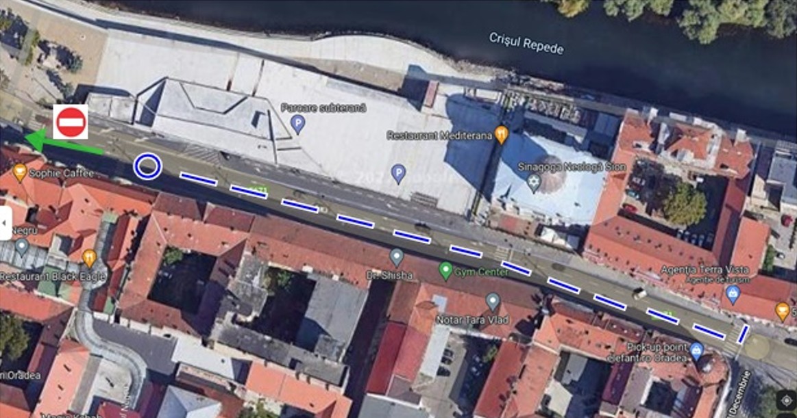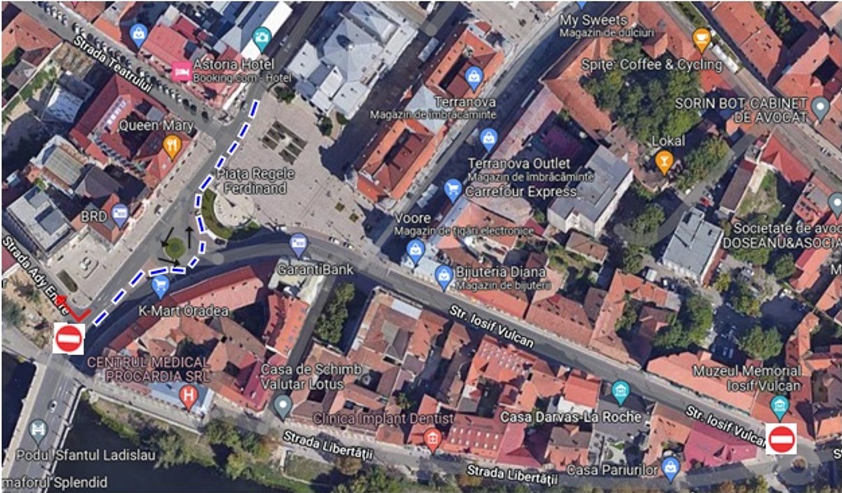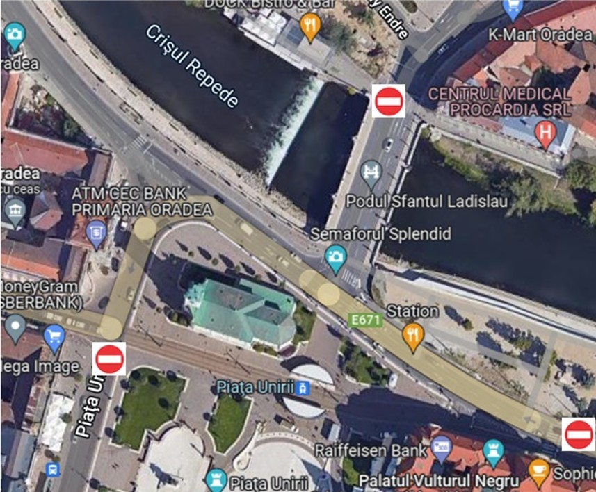 Podul Sfântul Ladislau, Str. Independenței, Str. Primăriei, Str. Vasile Alecsandri, Str. Mihai Pavel, Piața Emanuil Gojdu, Piața 1 Decembrie, Str. Teatrului, Str. Iosif Vulcan, Str. Patrioților, Calea Republicii, Str. Libertății.