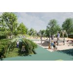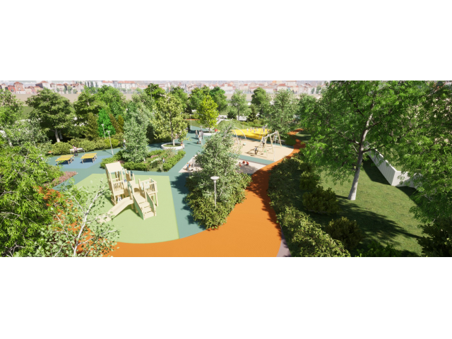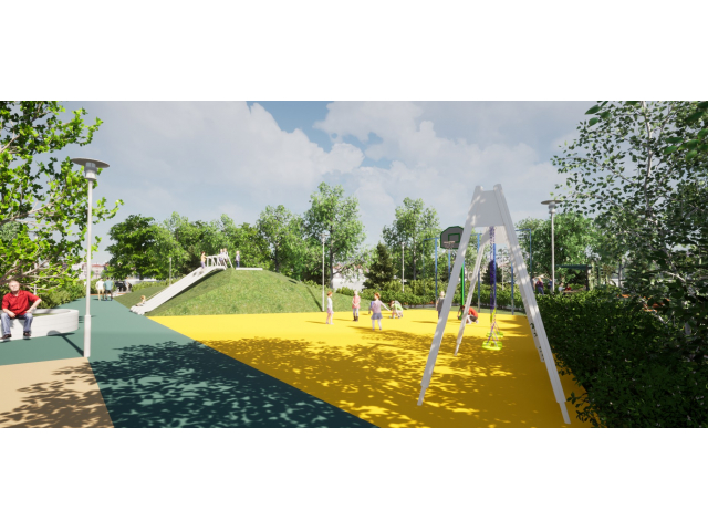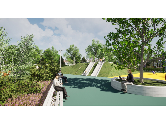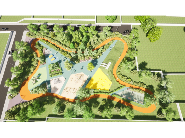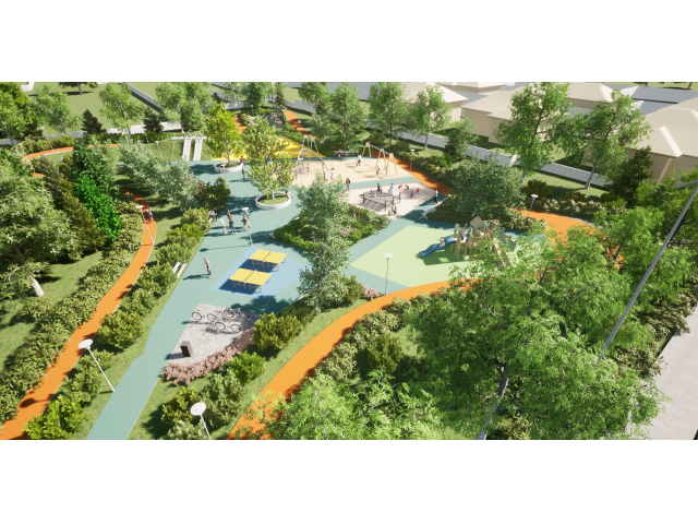 Noul parc va avea alei pietonale acoperite cu asfalt bituminos colorat în masă și o pistă de alergat cu tartan de culoare portocalie. De asemenea, acesta va dispune de un loc de joacă dotat cu echipamente interactive de joacă (ansamblu cu tobogane, leagăne duble cu și fără protecție, echipament pentru cățărare, complex de joacă cu apă și tobogane) și acoperit cu tartan și nisip.