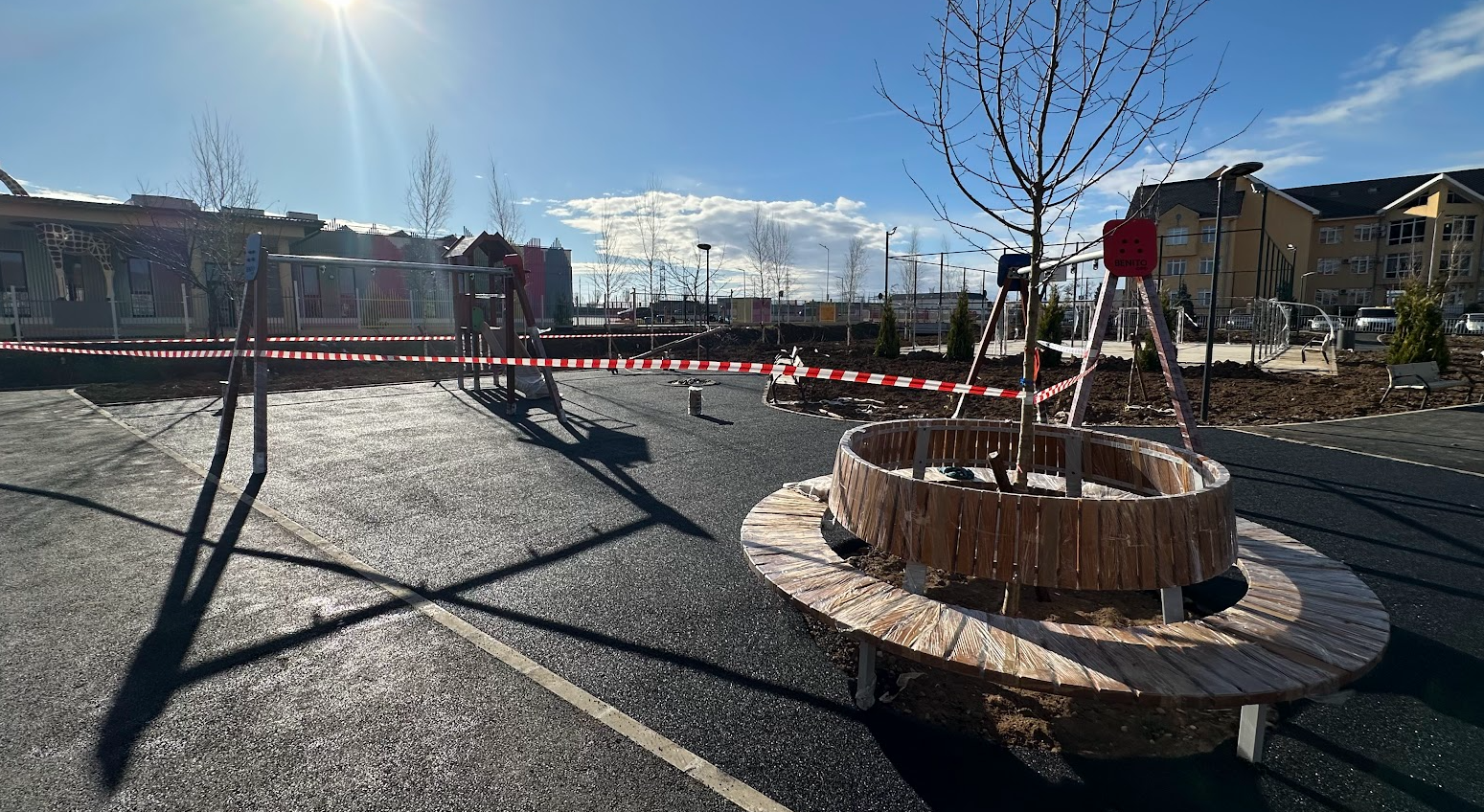 Odată cu încălzirea vremii, lucrările au fost reluate, iar echipele de muncitori au început turnarea primului strat de tartan în zona locului de joacă, urmând ca în perioada următoare să fie realizate aceleași operațiuni pentru terenul de sport și zona de relaxare.