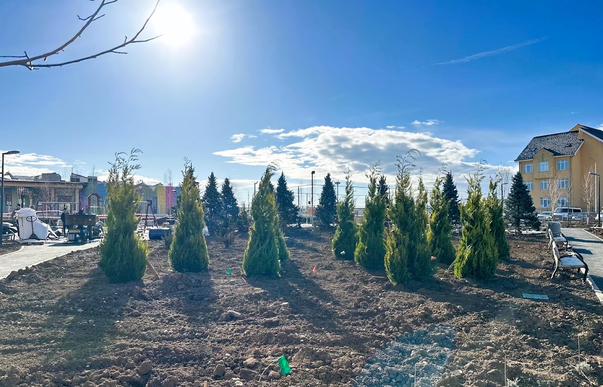 Din suprafața totală a terenului, 2.121 mp vor fi ocupați de spații verzi. Până în prezent, au fost plantați 98 de arbori din speciile brad argintiu, mesteacăn pletos, castan, chiparos de California și magnolie, alături de arbuști, plante perene și graminee.
