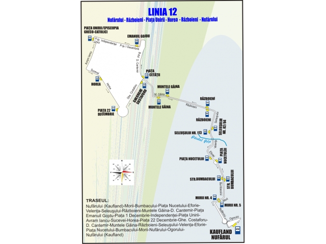 Linia 12 – str.Ogorului (Kaufland) – str.Nufărului – str.Morii – str.Bumbacului – str. Seleuşului – str.Războieni – str.Muntele Găina – str.D.Cantemir – Piaţa Cetăţii – Piaţa E.Gojdu – str.Independenţei – Piaţa Unirii – str.A.Iancu – str.Sucevei – str.Horea – Piaţa 22 Decembrie – str.Ghe.Costaforu – str.D.Cantemir – str.Muntele Găina – str. Războieni – str.Seleuşului – str.Bumbacului – str.Morii – str.Nufărului – str.Ogorului (Kaufland).