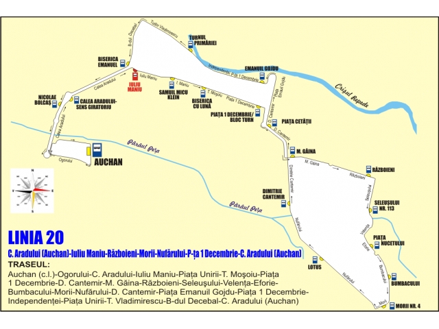 Linia 20 – str. Ogorului – str. C.Aradului – str. I.Maniu – str. T.Moşoiu – Piaţa Cetăţii – str.D.Cantemir – str.Muntele Găina – str.Războieni – str.Seleuşului – str. Bumbacului – str.Morii – str. Nufărului – str. D.Cantemir – Piaţa Cetăţii – Piaţa Em. Gojdu – Piaţa 1 Decembrie – str. Independenţei – str. T. Vladimirescu – B-dul Decebal – str.Calea Aradului – str.Ogorului.