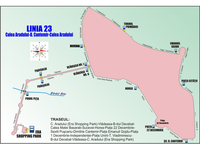 Linia 23 – str. Calea Aradului (Carrefour) – str.Vlădeasa – str.Calea M.Basarab – str.Sucevei – str.Horea – Piaţa 22 Decembrie – str.S.Puşcariu – str.D.Cantemir – Piaţa Cetăţii – Piaţa E.Gojdu – Piaţa 1 Decembrie – str.Independenţei – str.T.Vladimirescu – B-dul Decebal – str.Vlădeasa – str.Calea Aradului (Carrefour).