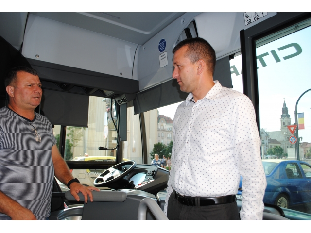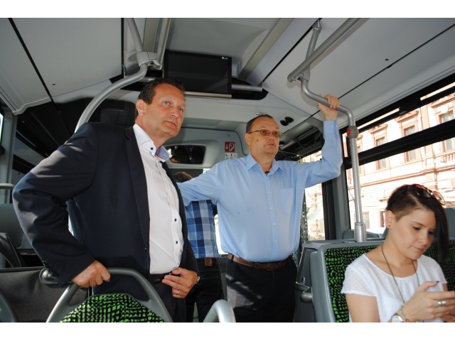 Viceprimarul Florin Birta a intat în noul autobuz urban MB Citaro Hybrid și a analizat dotările vehiculului prezentat.