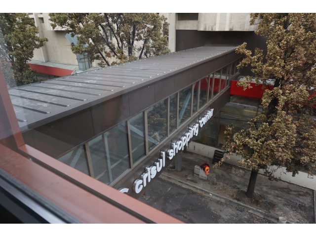 Construcția are șase niveluri supraterane: 1/2 demisol, parter, trei etaje şi o terasă. La etajul 2, este prevăzut un acces pietonal, printr-o pasarelă peste strada Braşovului, care a fost conectată cu magazinul Crişul. Costurile pasarelei au fost suportate de către firma care administrează centrul comercial.