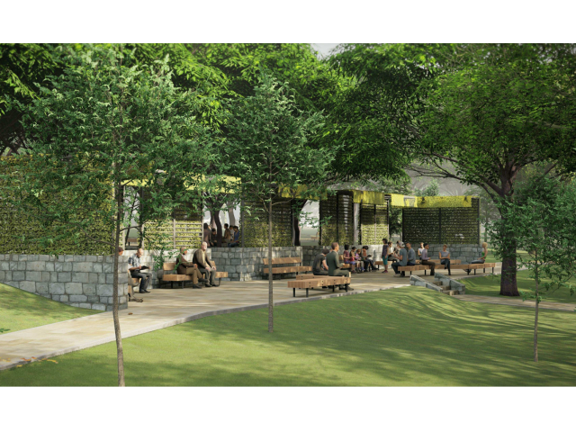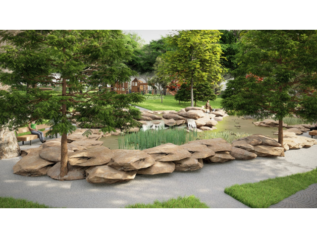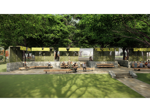 – amenajarea cu piatră cubică a aleilor principale și cu piatră spartă a celor secundare; reamenajarea locului de joacă pentru copii cu pardoseală din tartan pentru aria de joc și zona de siguranță și gazon pentru restul suprafeței; restaurarea parapeților/zidurilor de sprijin din piatră, a pergolei și zonei cu iaz și a grădinii japoneze prin utilizarea materialelor naturale (piatră);