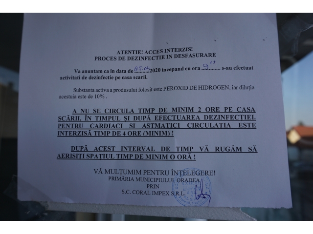 Primăria Oradea a demarat luni, 6 aprilie, prin Direcția Tehnică și Compartimentul Asociații de Proprietari, acțiunea de dezinfecție a scărilor de bloc din municipiu, ca măsură pentru combaterea răspândirii coronavirusului, în conformitate cu Ordonanța Militară nr. 4 din 29 martie 2020 și cu prevederile Ordinului ANRSC 82/2015.