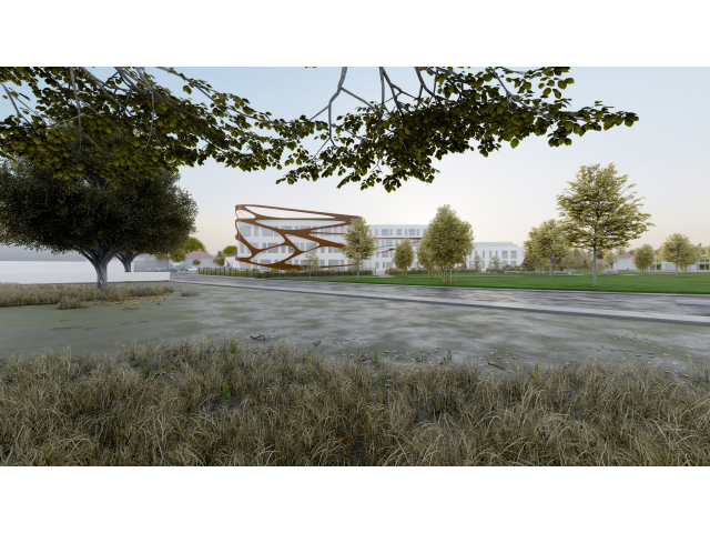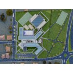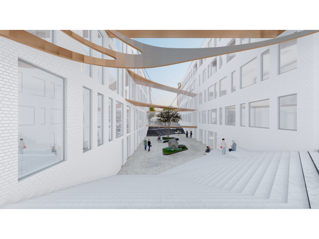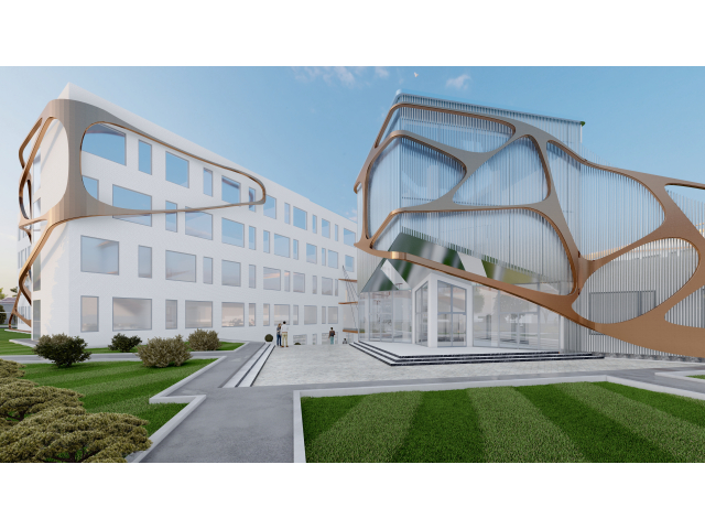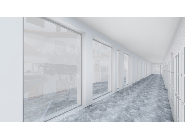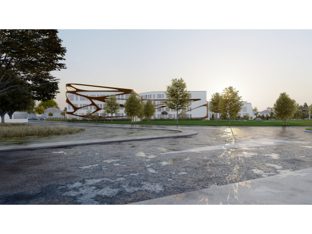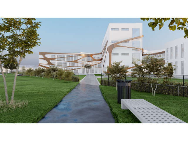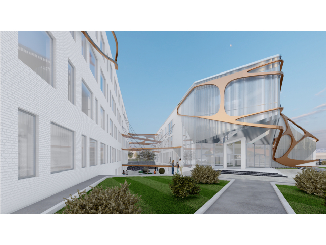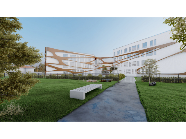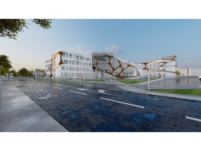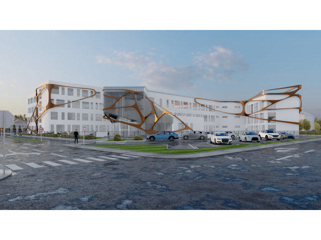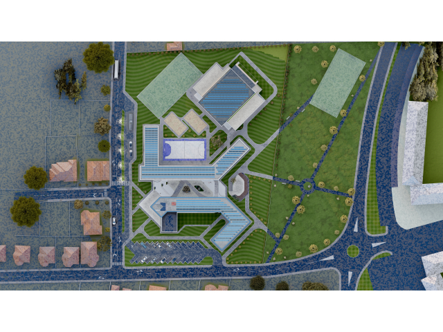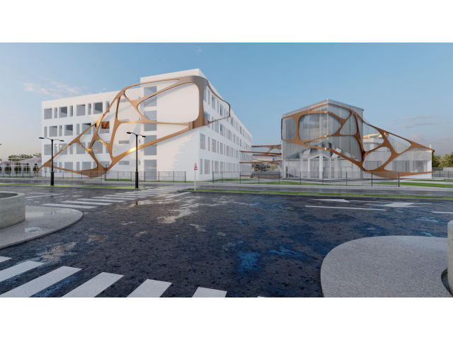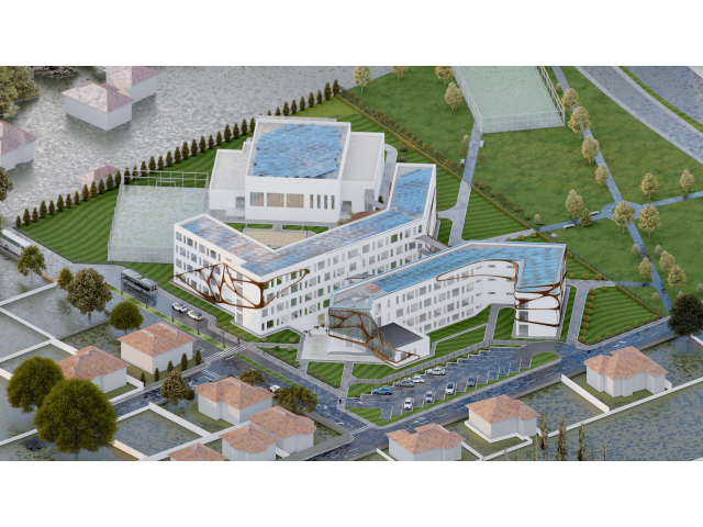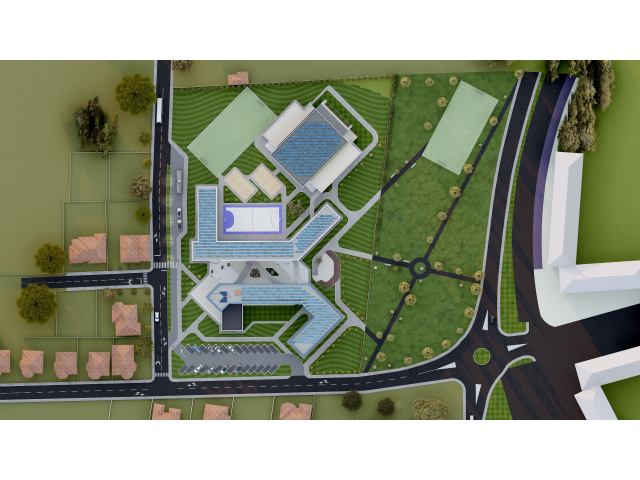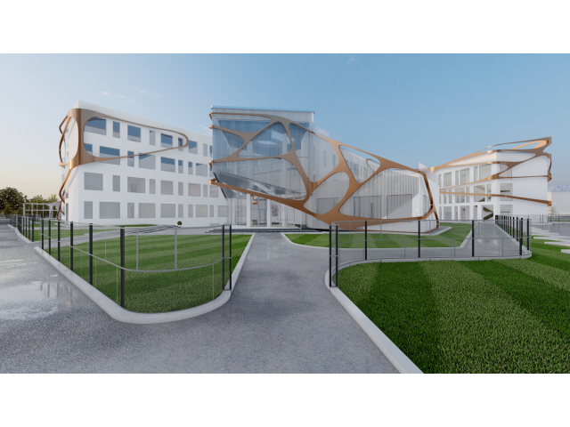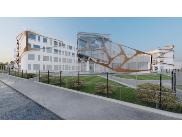 Noua școală va avea două corpuri de clădire (corpul A+B) cu destinația unitate de învățământ și un al treilea corp (corpul C) dedicat activităților sportive.
