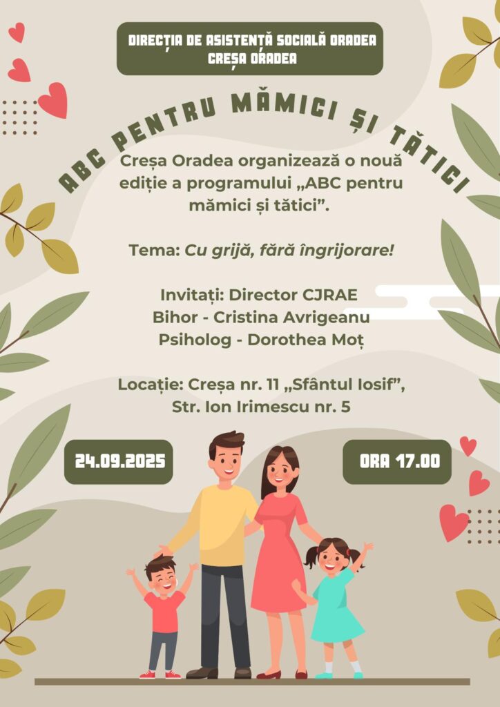 Direcția de Asistență Socială Oradea, prin Creșa Oradea, dă startul unei noi ediții a programului „ABC pentru mămici și tătici”, un proiect dedicat părinților care își doresc să fie mai bine informați, mai pregătiți și mai conectați la nevoile copiilor lor.