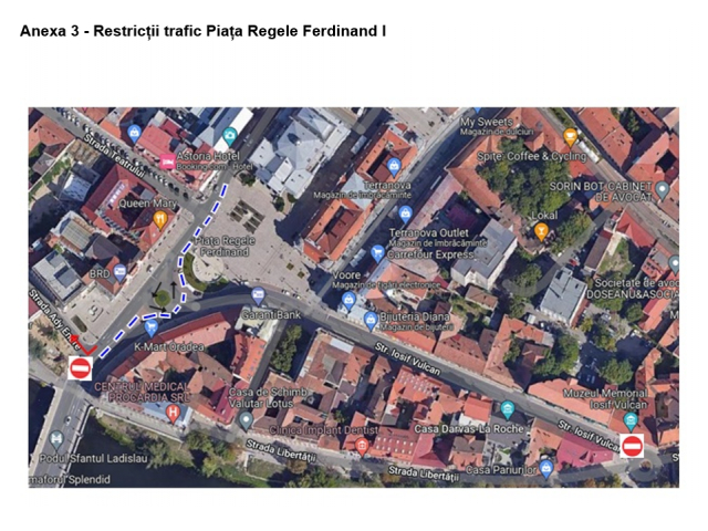 – Piața Regele Ferdinand I: în 14 octombrie, între orele 19:00 și 00:00 și în zilele de 15 și 16 octombrie, în intervalul orar 10:00 – 00:00, accesul auto va fi interzis pe str. Iosif Vulcan, atât dinspre Podul Sf. Ladislau, cât și din str. Libertății. (foto)