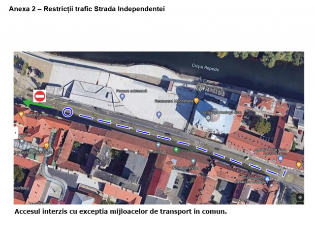 – Str. Independenței: în 14 octombrie, între orele 19:00 și 00:00 și în zilele de 15 și 16 octombrie, în intervalul orar 10:00 – 00:00, accesul cu mașina va fi interzis, permițându-se doar accesul în parcarea publică supraetajată, cu posibilitate de întoarcere pe str. Independenței până la intersecția cu str. Piața 1 Decembrie. (vezi foto).