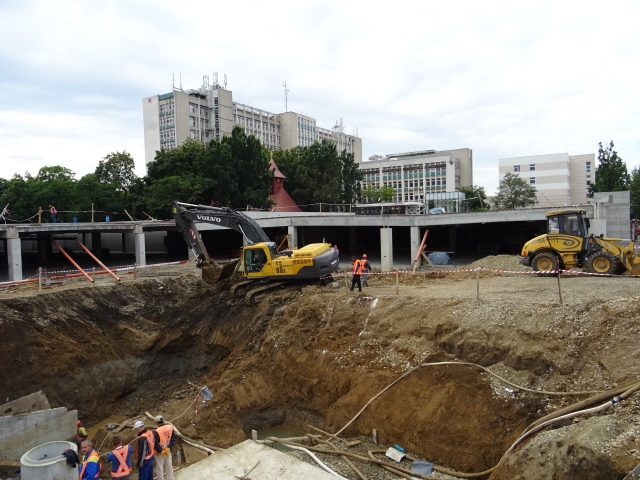 Azi, 17 august, Construcţii Bihor a început montarea plăcilor prefabricate pentru realizarea pasajului care va face legătura între parcarea subterană D+P şi Piaţa Rogerius.
