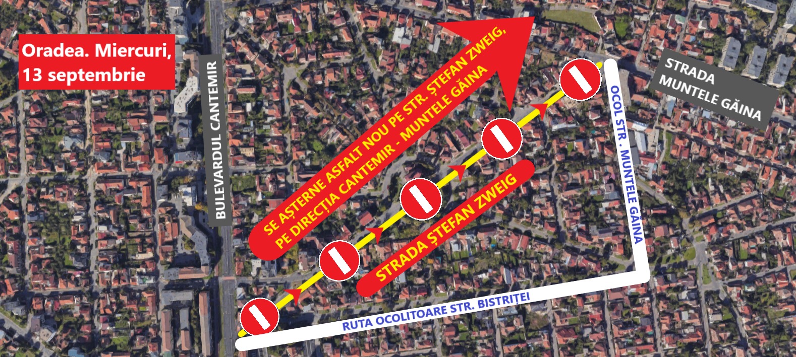 Din acest motiv, după ora 9:00 dimineața traficul va fi deviat pe rute ocolitoare, pe străzile Bistriței și Muntele Găina, urmând ca, în cursul după-amiezii, sensul de mers afectat de pe strada Ștefan Zweig (Cantemir spre Muntele Găina) să fie redat traficului.