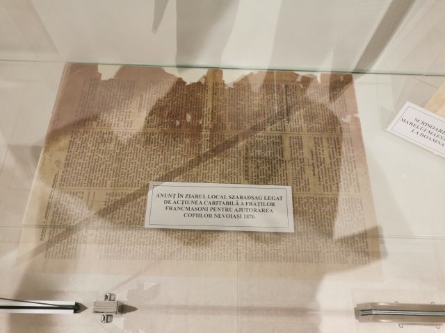 Expoziția dedicată Lojii masonice „Regele Ladislau”, înființată în 1872, cuprinde cele două steaguri originale ale Marii Loji Naţionale din România din 1923 şi documente de corespondenţă din perioada 1876 – 1900 ale lojii, precum și numeroase artefacte specifice mișcării francmasonice.