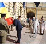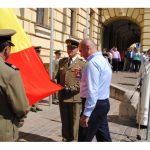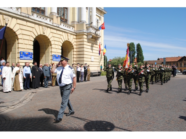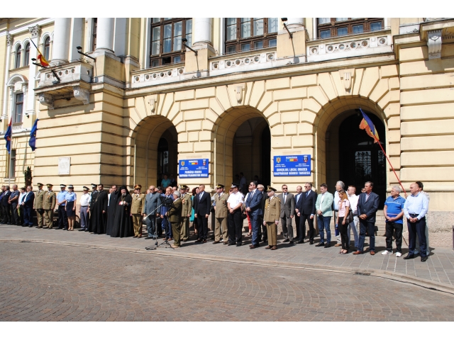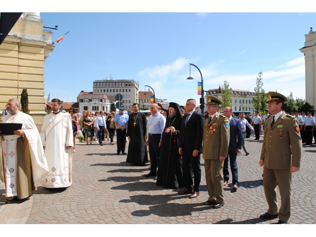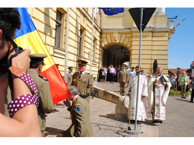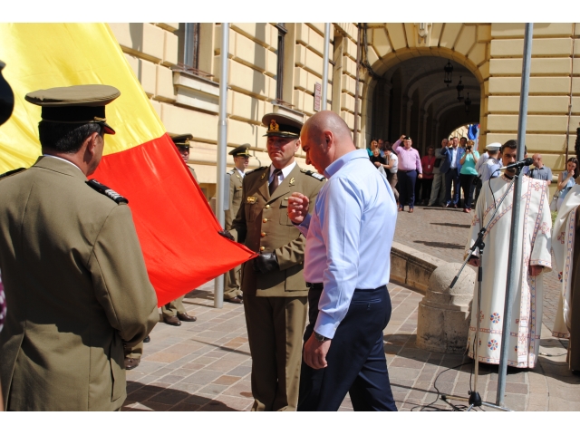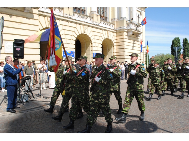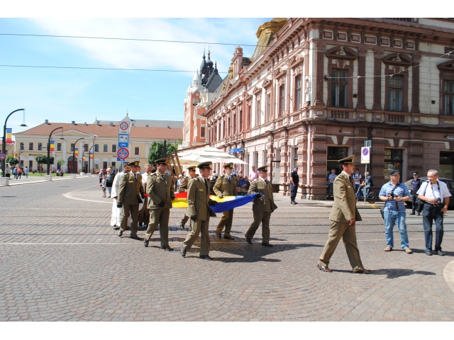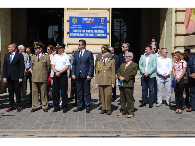 Cu ocazia Zilei Drapelului Naţional, autorităţile locale au organizat azi, în faţa Primăriei Oradea, o ceremonie militară. Ceremonia a debutat cu oficierea slujbei de sfinţire a drapelului naţional la Biserica cu Lună, urmată apoi de prezentarea onorului şi salutul drapelului de luptă în faţa Primăriei.