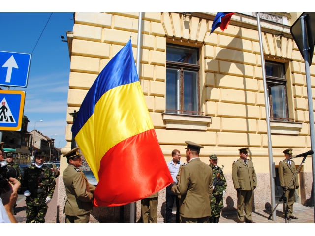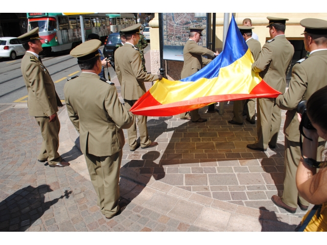 Drapelul României a fost apoi înălţat pe catarg, dar nu înainte de sărutarea acestuia de către oficialităţile prezente la ceremonie. În finalul ceremoniei, s-a intonat Imnul Naţional al României şi a avut loc defilarea gărzii de onoare.