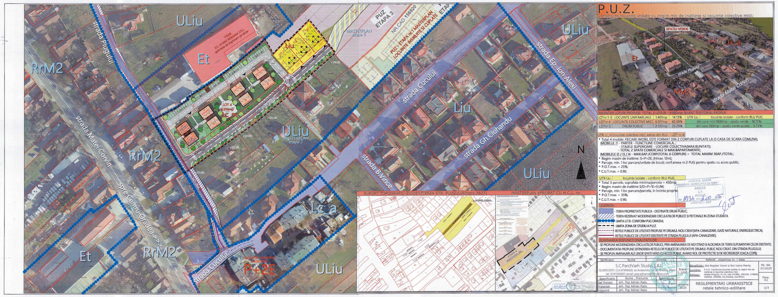 – Operatiuni cadastrale de alipire si dezmembrare rezultand 5 loturi (3 loturi destinate construirii de locuințe individuale unifamiliale sau bifamiliale, un lot destinate construirii unui ansamblu de locuințe colective mici, un lot destinat constituirii unui drum public cu profil transversal de 12,0m și lărgirii str.Plugului la profil transversal de 9,0m (conform propunerii prezentate in plansa U/3);