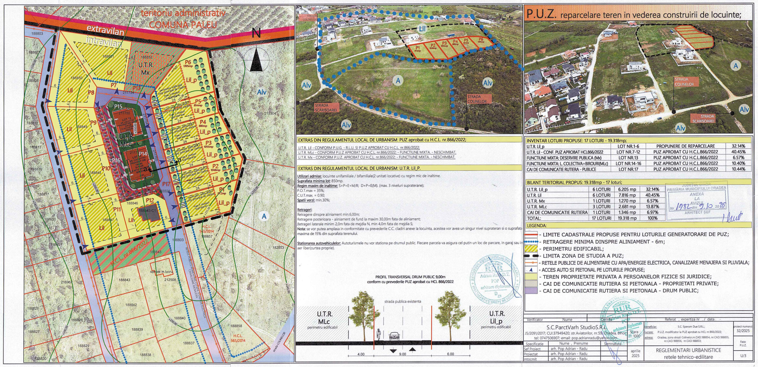 a) Modificarea parcelarului studiat prin PUZ aprobat cu HCL nr.866/2022, conform propunerii prezentate in plansa U/3; Astfel pe zona de studiu se identifică un număr de 17 loturi (12 loturi destinate construirii de locuințe unifamiliale sau cu 2 unități locative (P1-P6), (P7-P12), 2 loturi destinate locuințelor colective (P14, P15), un lot destinat unor funcțiuni de tip mixt (P13), un lot reprezentând drum public (P17), un lot reprezentând alee carosabilă privată și parcări (P16)