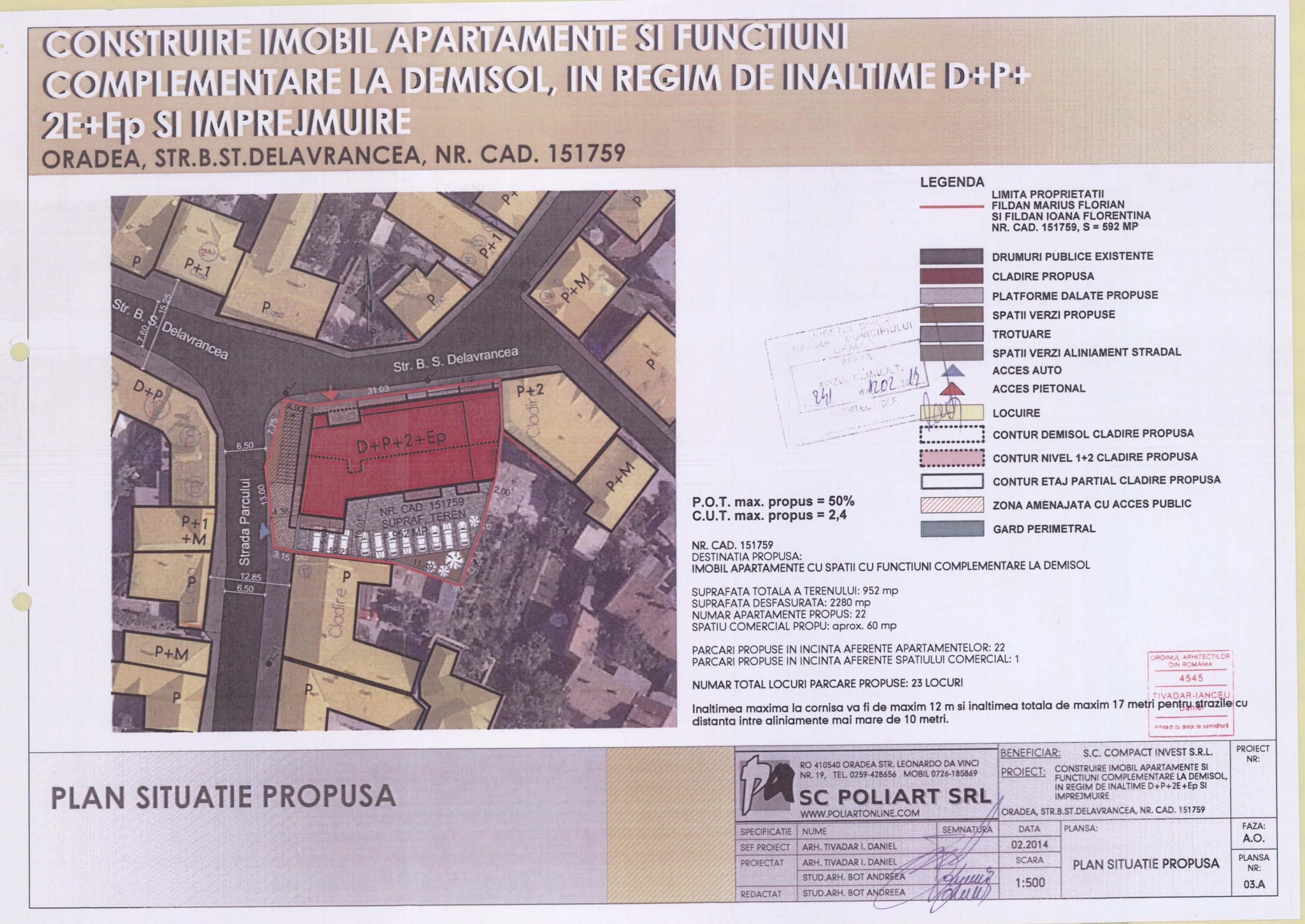 Imobilul care urmeaza sa fie amplasat pe parcela identificata cu nr. cad. 151759 va contine 22 de apartamente si functiuni complementare la demisol. Mobilarea parcelei va respecta urmatoarele conditii: