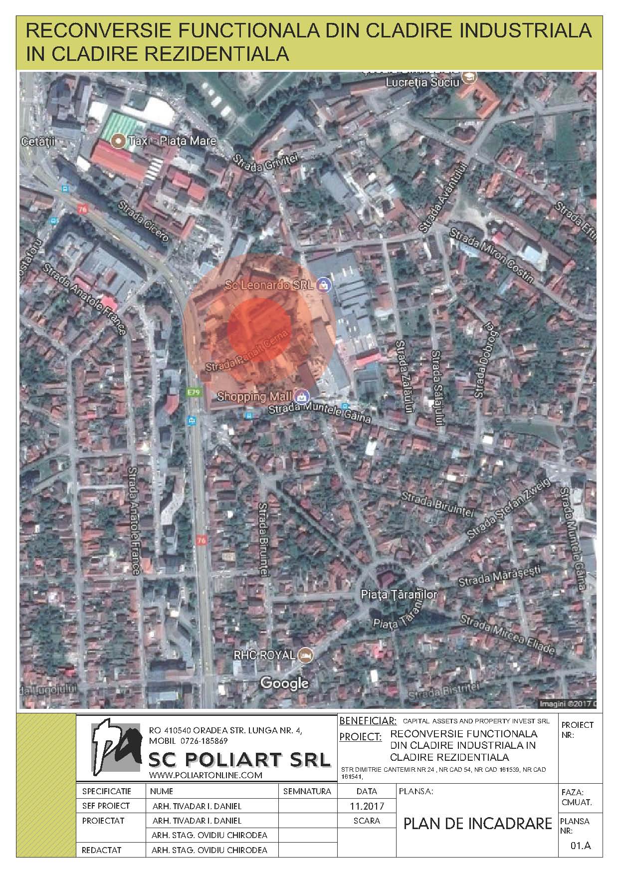 Prin planul urbanistic zonal initiat de SC CAPITAL ASSETS LAND AND PROPERTY INVEST SRL, se propune reconversie functionala a unei cladiri industriale in cladire de locuinte colective, str. D.Cantemir – str. Panait Cerna, nr.cad.54 – Oradea, in urmatoarele conditii: