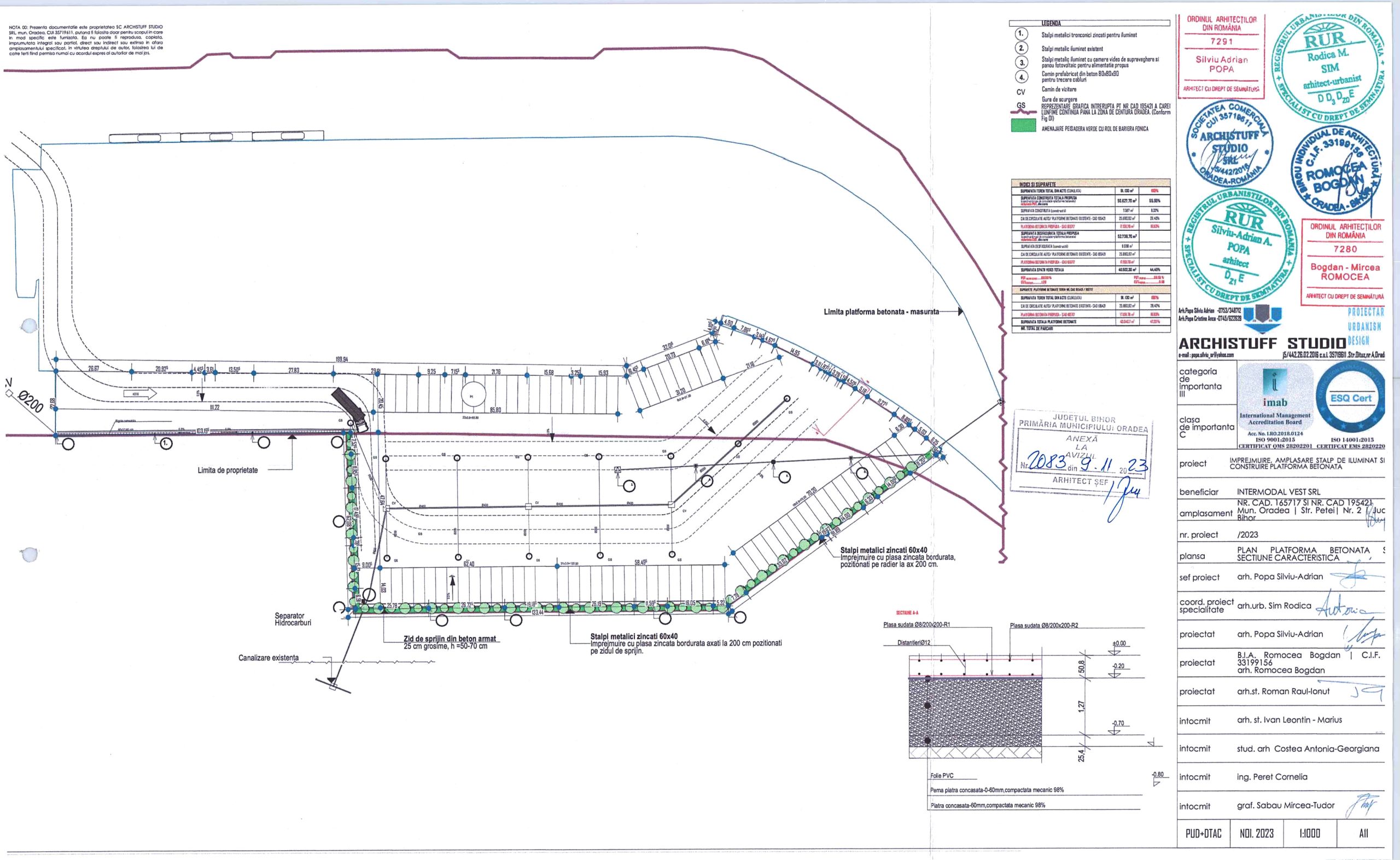 – Prezenta documentatie tehnica propune alipirea terenurilor cu nr.cad.165717 (fara acces la drum public) si nr.cad.195421 (acces din str. Petei) formand o incinta, proiectarea unei platforme din beton armat, destinata parcarii de tiruri, amenajare locuri de parcare pentru tir-uri, amplasare stalpi de iluminat, imprejmuire;