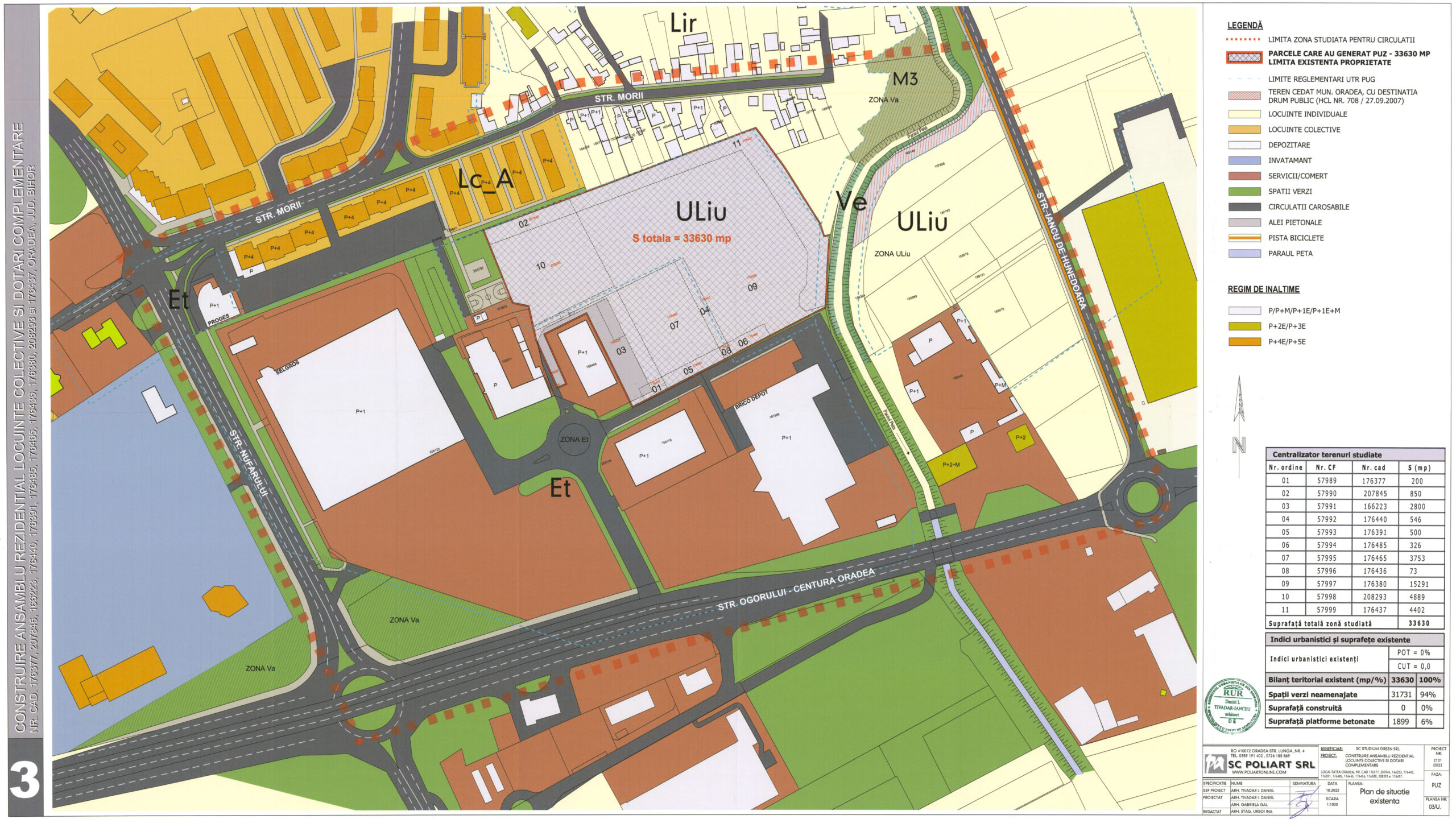 “1. Din punct de vedere functional, terenul ce face obiectul prezentului plan urbanistic zonal a fost reglementat prin PUZ aprobat prin HCL 501/2016 cu destinatia ansamblu locuinte colective, functiuni complementare si dotari de cartier. POT maxim si CUT maxim propusi sunt in concordanta cu RLU aferent PUG Oradea, fara sa se propuna prin PUZ modificarea acestora;