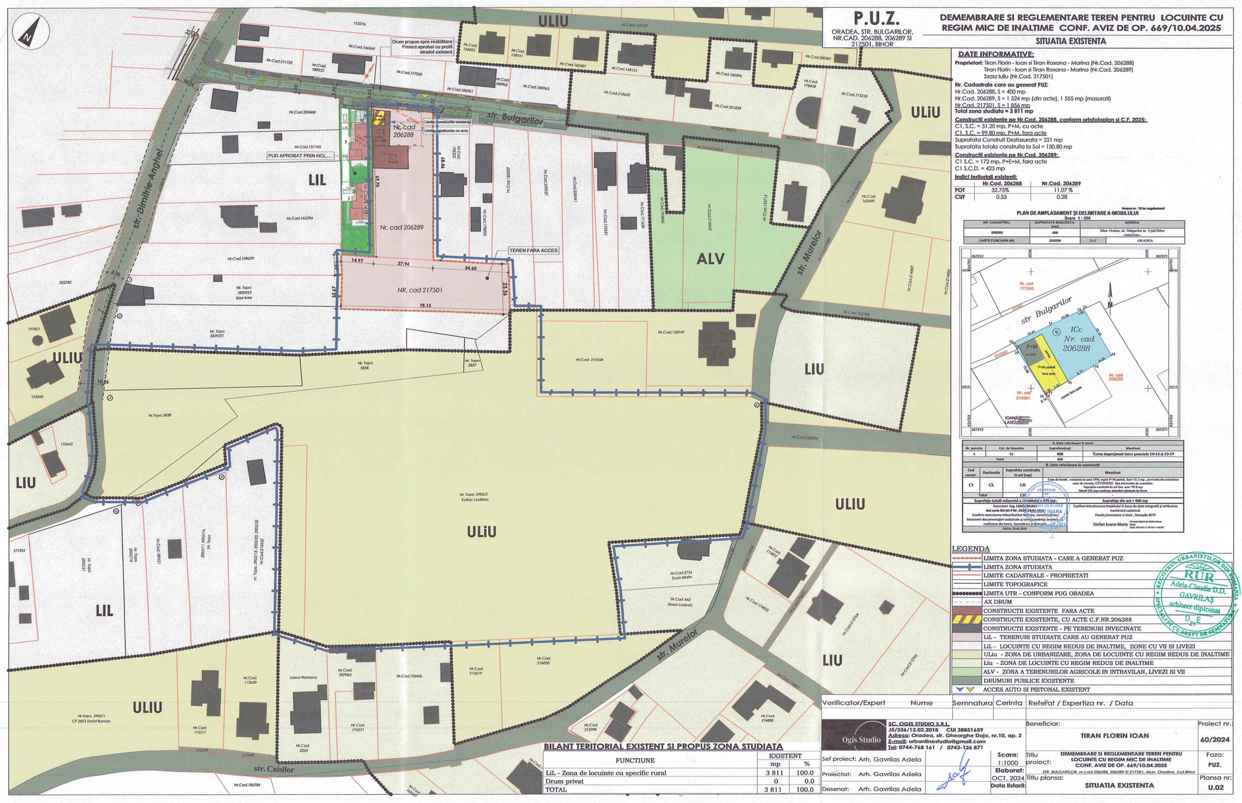 PUZ – Dezmembrare și reglementare teren pentru construire locuințe cu regim mic de înalțime, nr.cad.206289, 206288, 217501, str. Bulgarilor, nr.5, Oradea